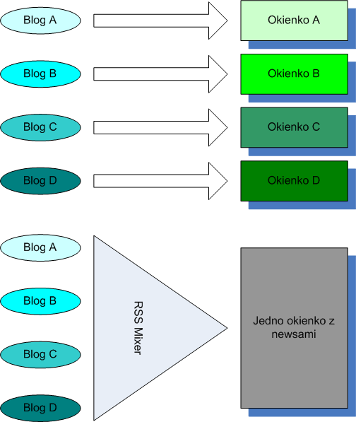 Rysunek poglądowy przedstawia sedno problemu. Na WordPressach możemy ustawić jedno okienko (zwane widgetem), które jest w stanie nasłuchiwać jednego kanału RSS. To znaczy, że jeśli chcemy nasłuchiwać 4 blogi, musimy ustawić 4 niezależne widgety. Sporo klikania i sporo miejsca na naszej stronie zostanie zmarnowane.