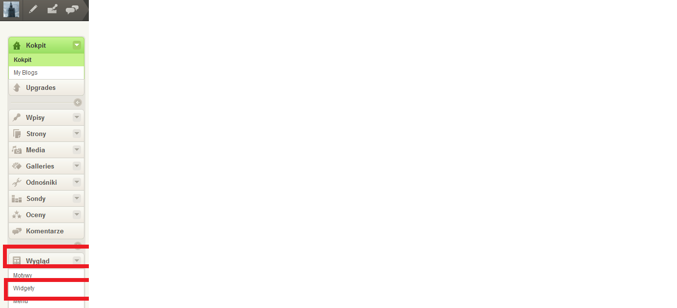 Dalej, szukamy na menu Kokpitu opcji wyglądu bloga i ustawień Widgetów.