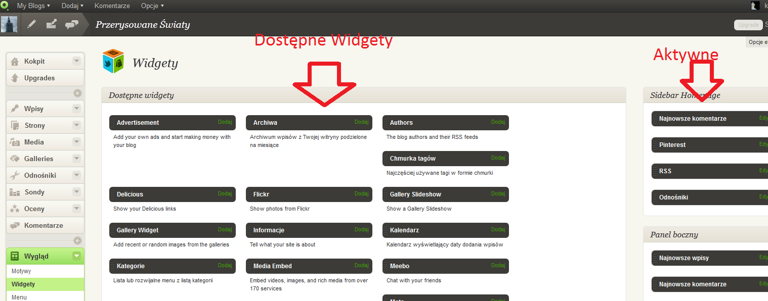 Zalogujemy się najpierw do kokpitu sterowania blogiem i wejdziemy w zakładkę Widgetów.